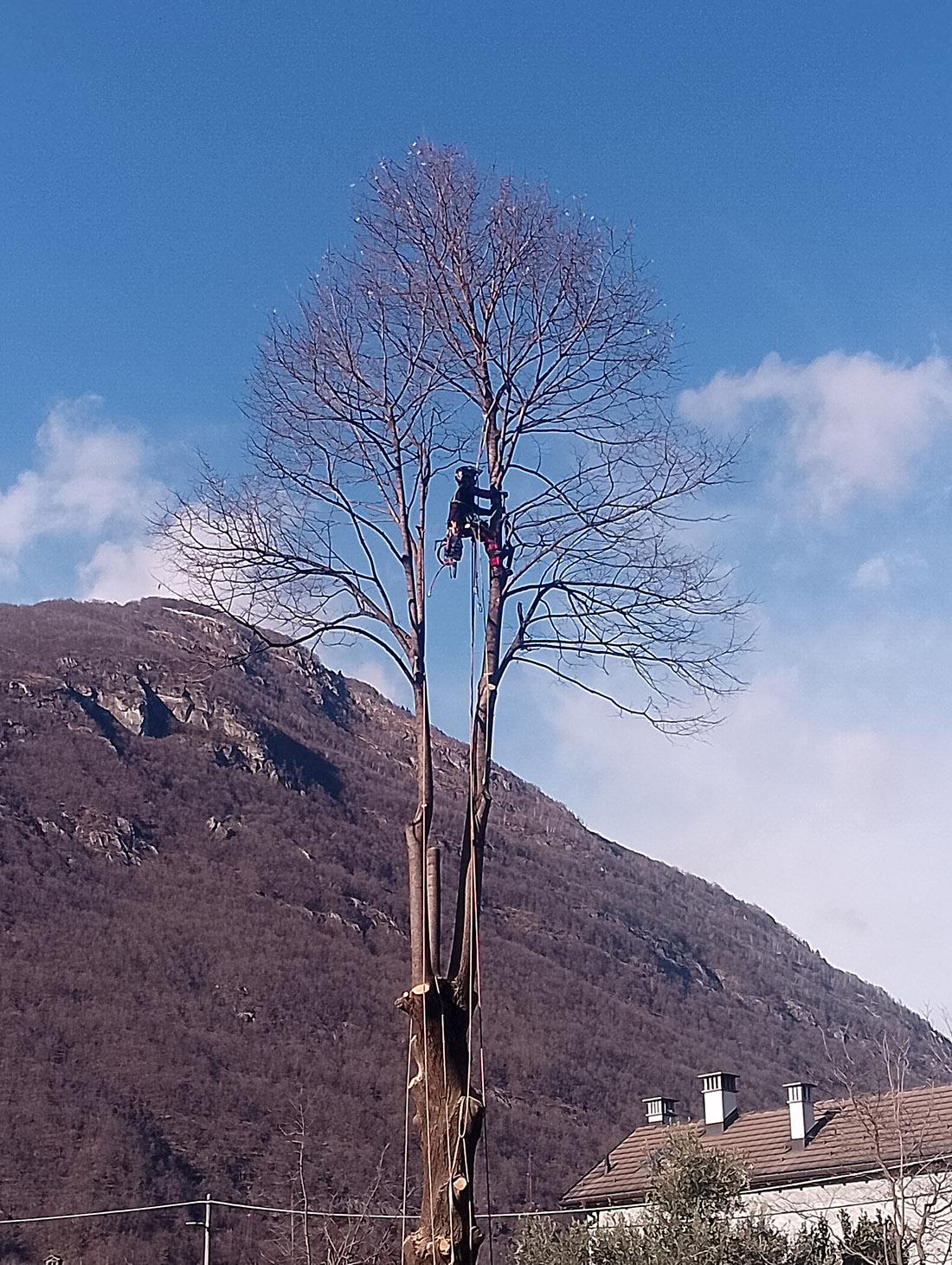 - Tree climbing professionale — con arboricoltori certificati che salgono in pianta usando corde e imbragature, raggiungendo ogni punto senza danneggiare la struttura